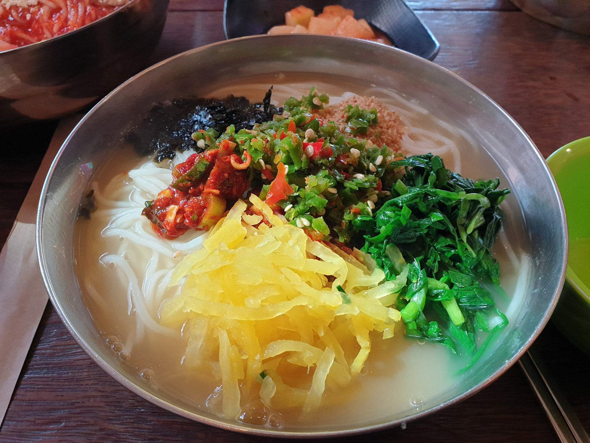 굵은 면발에 단무지와 나물. 양념장과 깨소금 김가루, 땡초까지 해서 어우러지는 맛이 일품입니다.